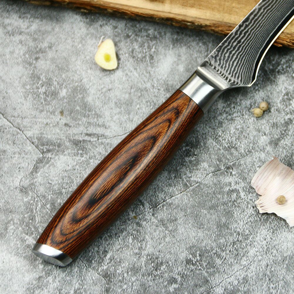 The Boning Knife VG10 Pakka Handle’s blade is its beating heart. This blade’s Damascus VG-10 Steel core gives it outstanding strength, longevity, and a stunning appearance. The blade is a work of art that you can proudly use because of the exceptional craftsmanship and top-notch materials used to create it.