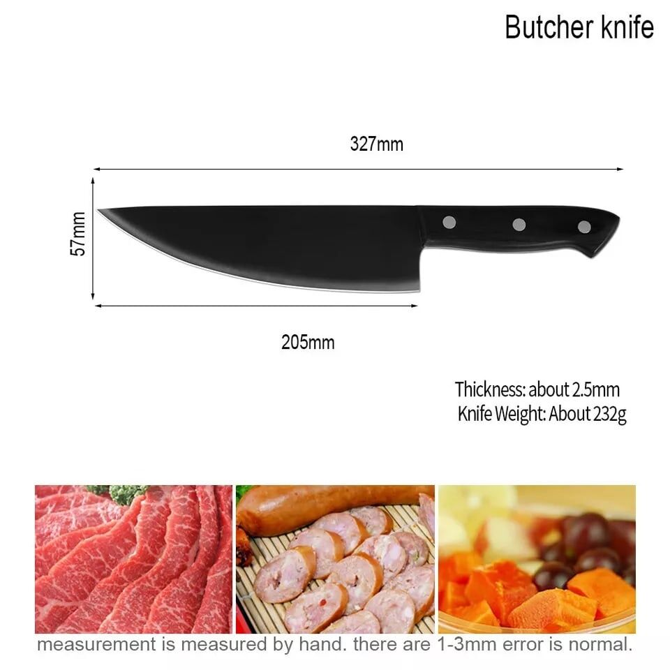 The Chef Knife All Black measures 327*57mm and has a 205mm blade length, striking the ideal balance between agility and cutting surface area. You can quickly and confidently handle bulky meats, bones, and poultry thanks to the hardwood handle’s soft and firm grip.