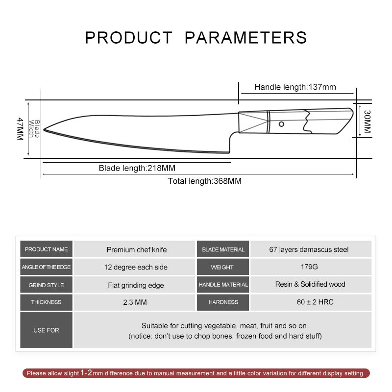 If you want a Chef Knife in 67 Layers Damascus Steel that combines performance, elegance, and personal meaning, this 67-layer Damascus chef knife delivers. With a sharp 12° per-side edge, a stable 60 HRC hardness, a versatile 218 mm blade, lightweight 179 g balance, and a unique resin and solidified wood handle, it is built for confident daily cooking. Add free engraving, and it becomes more than a knife—it becomes your knife.