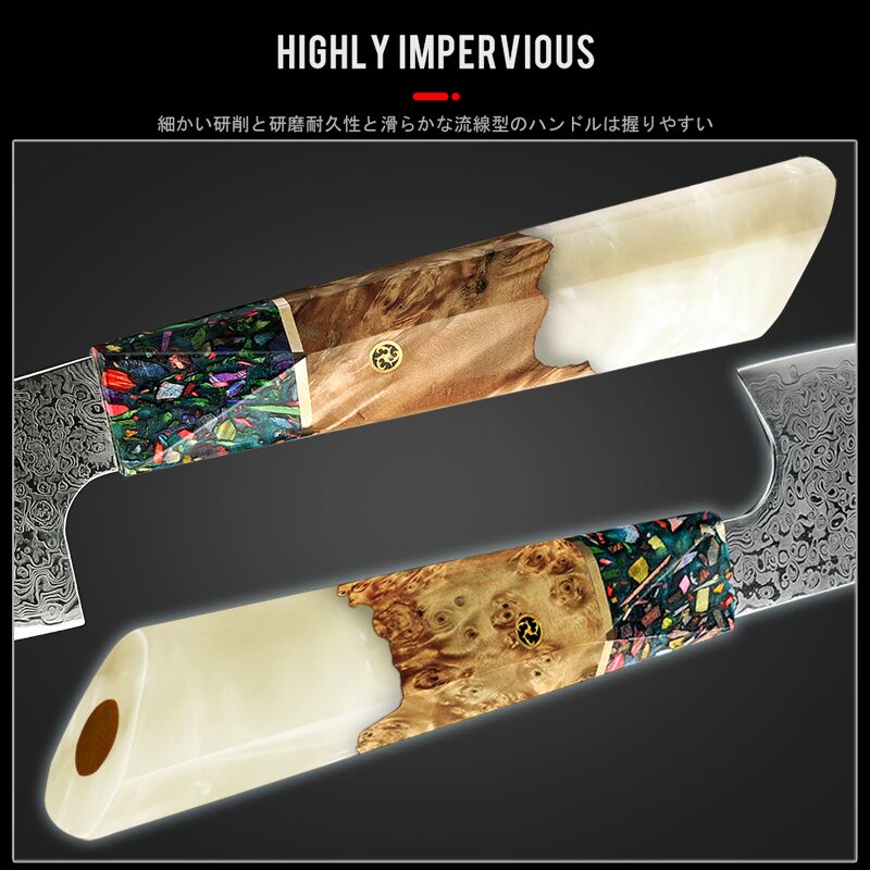The handle is made from resin and solidified wood, creating a bold, artistic look with natural warmth. Each handle has its own pattern, grain, and color variation, which means no two knives feel exactly the same. It is a combination that looks elegant, feels premium, and stands out in any kitchen.