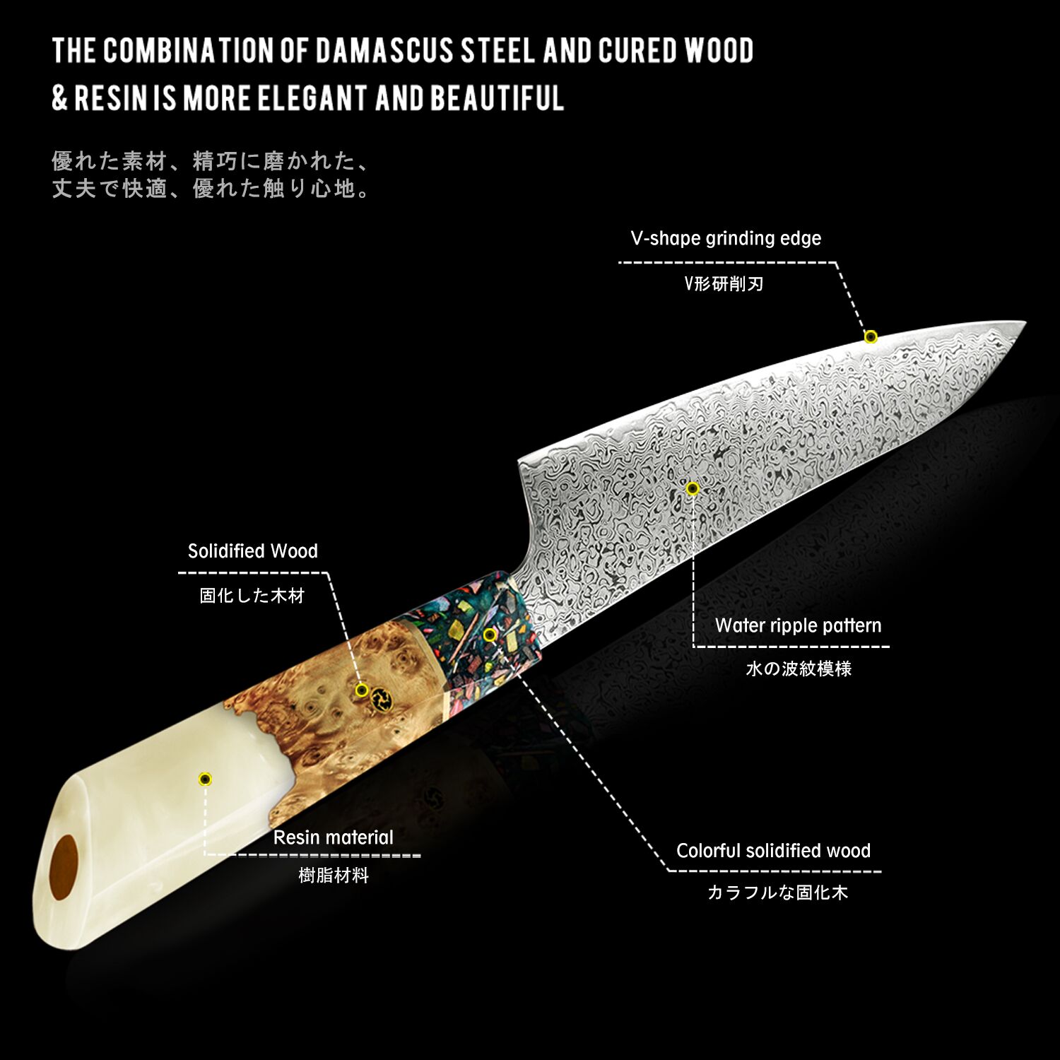 67-Layer Damascus Chef Knife with Resin and Solidified Wood Handle