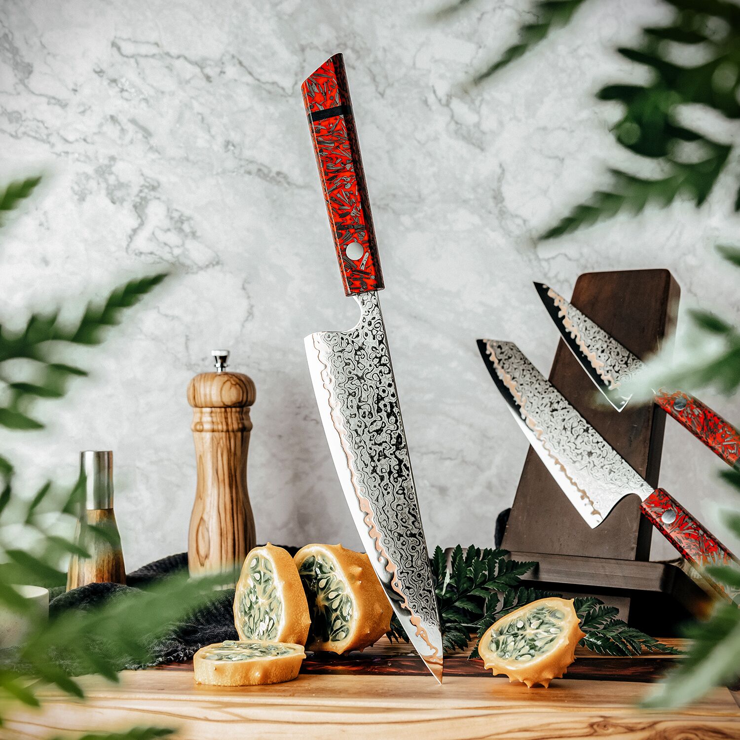 The handle is where this knife becomes unmistakably yours. The red resin + carbon fiber combination gives a striking “ember” look with a modern texture, and it’s shaped for comfort during long prep sessions. Handle length is 139 mm and handle width is 28 mm—dimensions that sit naturally in the hand and help you maintain control whether you’re pinch-gripping near the blade or holding further back for longer slices.