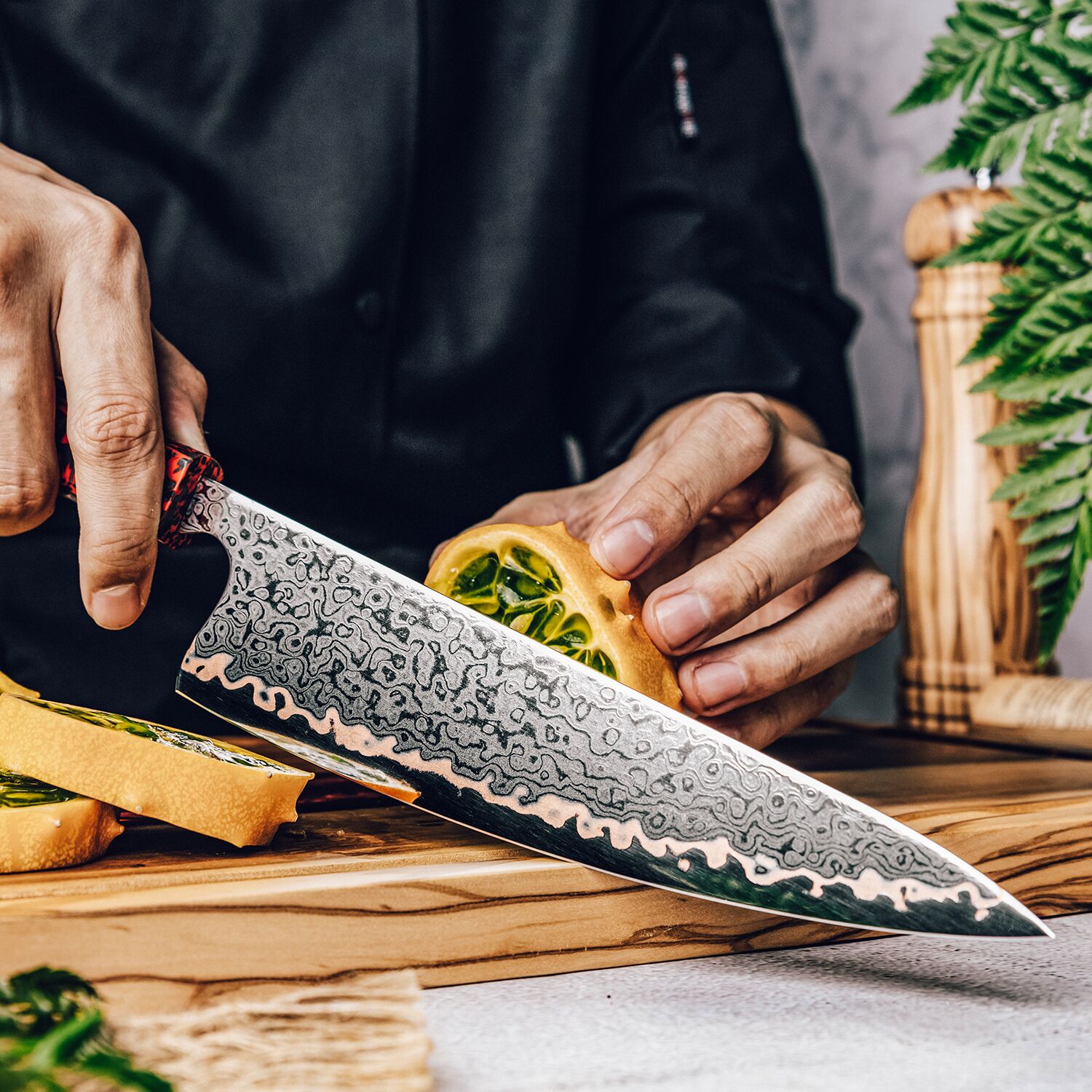 This Copper Damascus Chef Knife is made for slicing and precision prep: vegetables, fruit, boneless meat, and everyday kitchen tasks. Like most fine edges, it should not be used to chop bones, frozen food, or very hard items. Use a proper cutting board, clean and dry after use, and store safely to protect the edge. Treated with basic respect, this blade will stay sharp, look stunning, and perform like a true premium piece.