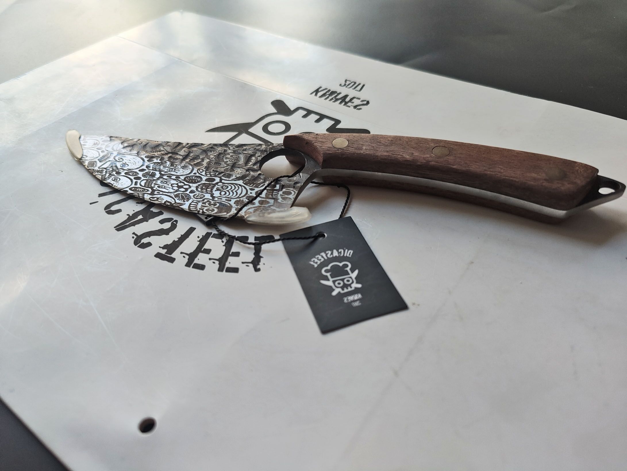 The balanced proportions of this knife, which measures 25*5cm and has a 12.5cm blade, enable adaptability in a range of cutting jobs. Its flexibility shows in both challenging kitchen jobs and outdoor experiences. The Curved Knife Mexican Skull is a dependable tool for deboning, skinning, slicing meat, and hunting.
