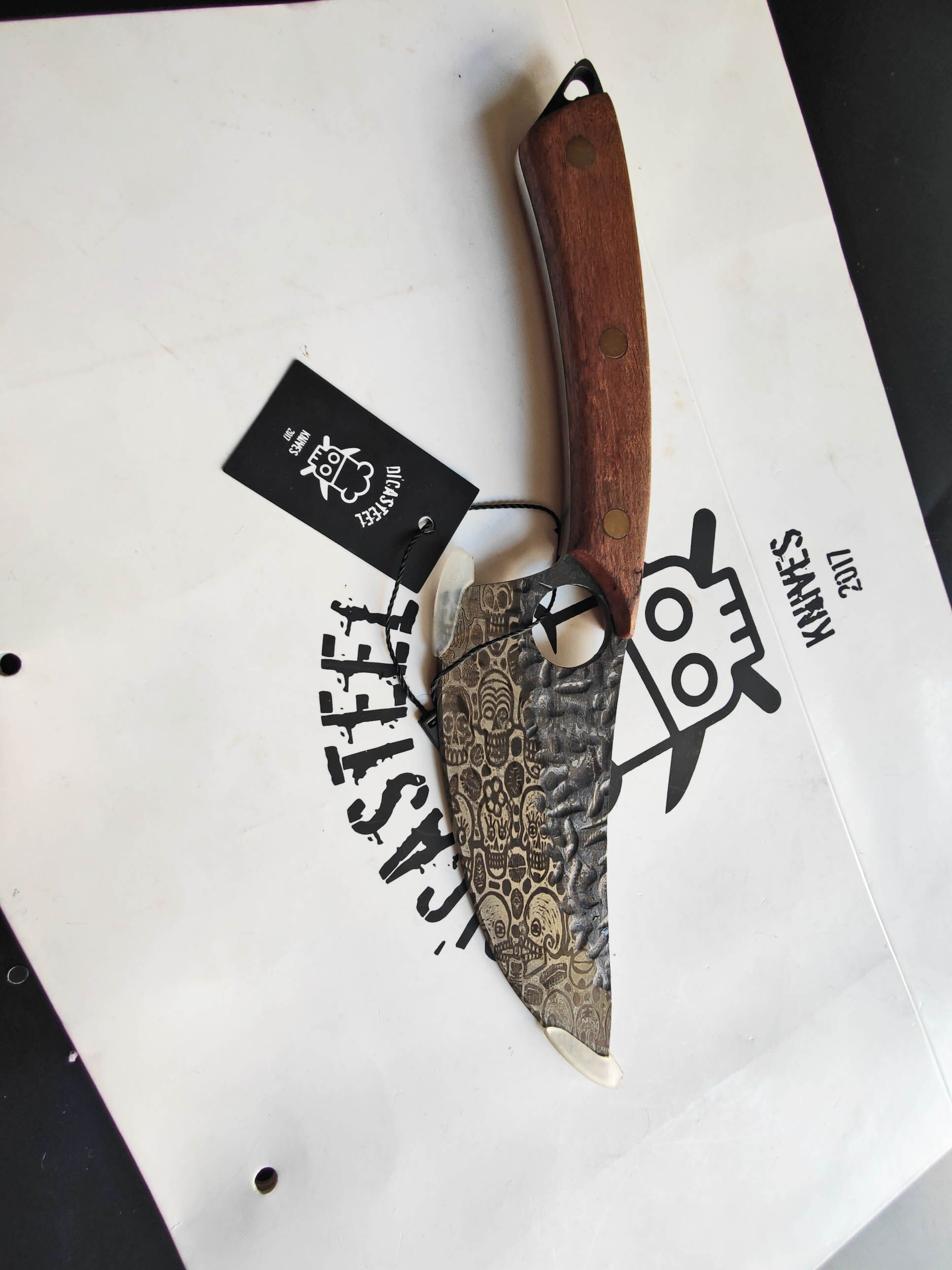 The Curved Knife Mexican Skull transforms your culinary experience by fusing outstanding performance with spectacular looks. This fixed blade masterpiece was expertly crafted from premium 3Cr13 stainless steel and sports a sturdy 4mm thickness, providing longevity and precise cuts with each use.