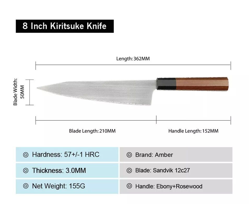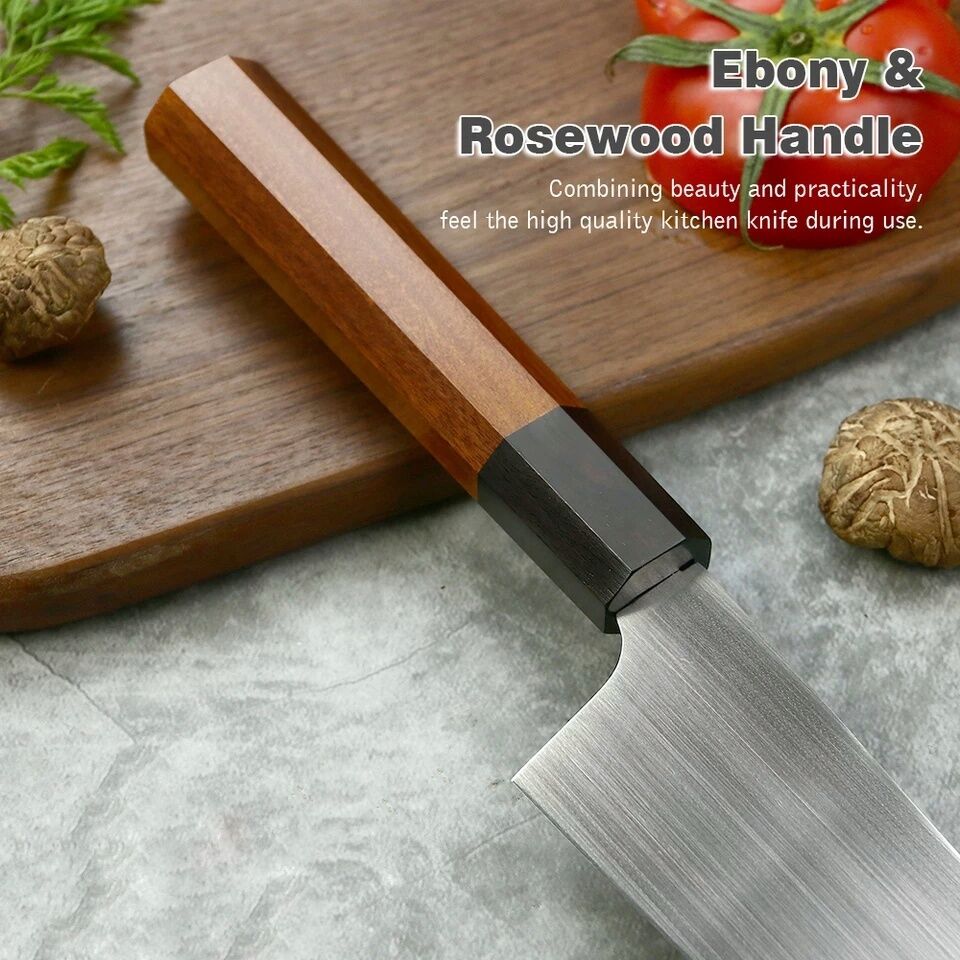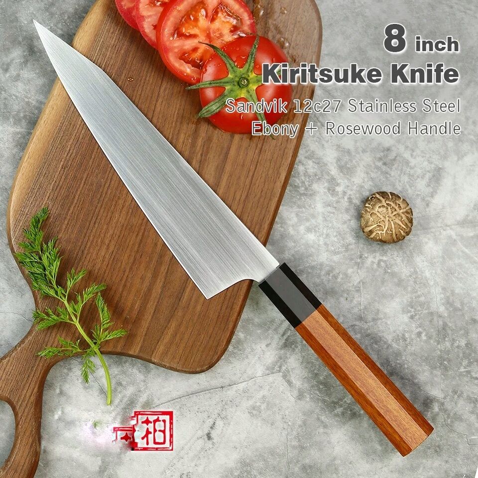Every facet of the Japanese Kiritsuke Knife is crafted with purpose. From its Sandvik 12c27 blade material, designed for optimal sharpness and longevity, to its handle’s blend of ebony and rosewood for comfort and elegance, this knife embodies a harmonious blend of form and function. Elevate your cooking experience and immerse yourself in the world of Japanese culinary artistry.