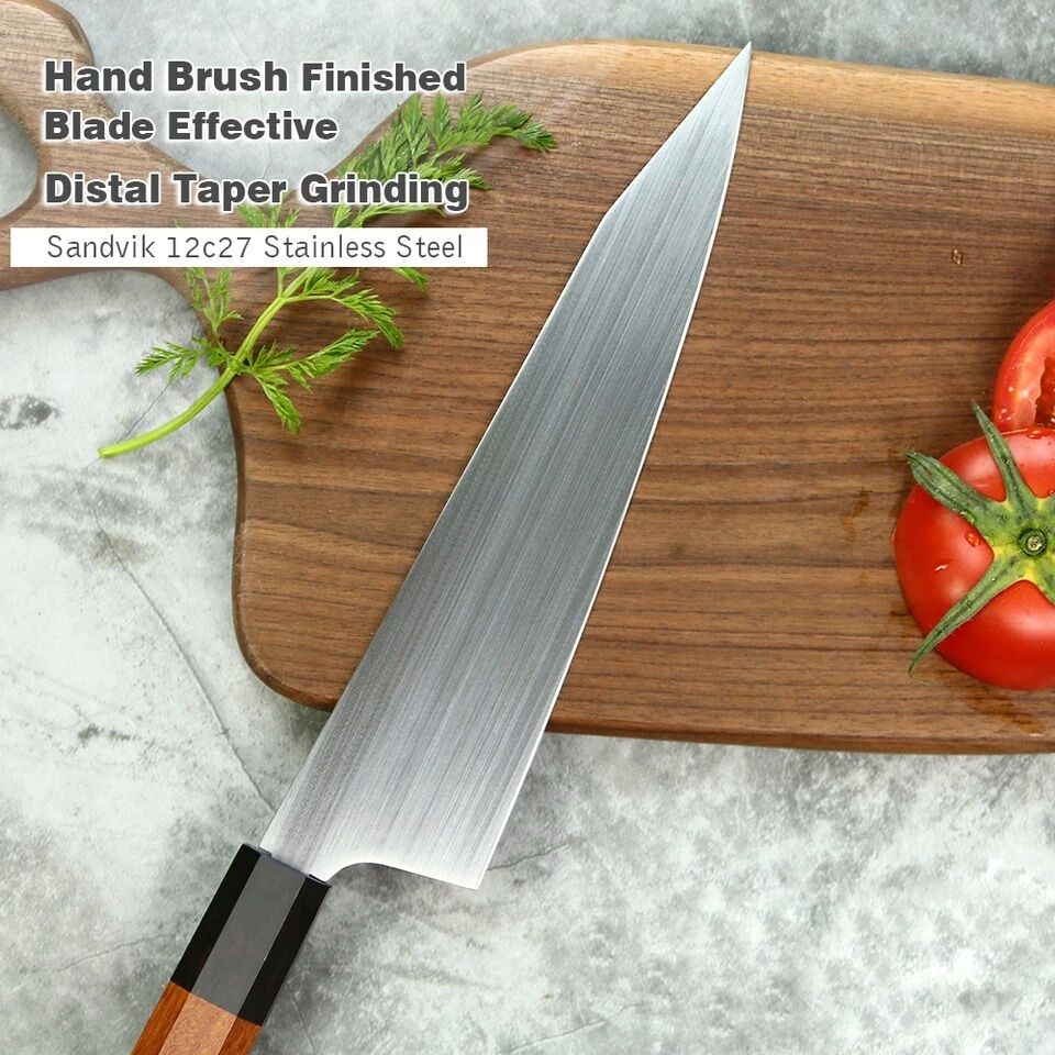 The Japanese Kiritsuke Knife is a testament to unwavering commitment to performance. Its blade, crafted from Sandvik 12c27, is known for its exceptional edge retention and corrosion resistance. This ensures that every slice, dice, and cut is executed with precision and finesse, allowing you to create culinary masterpieces that stand the test of time.