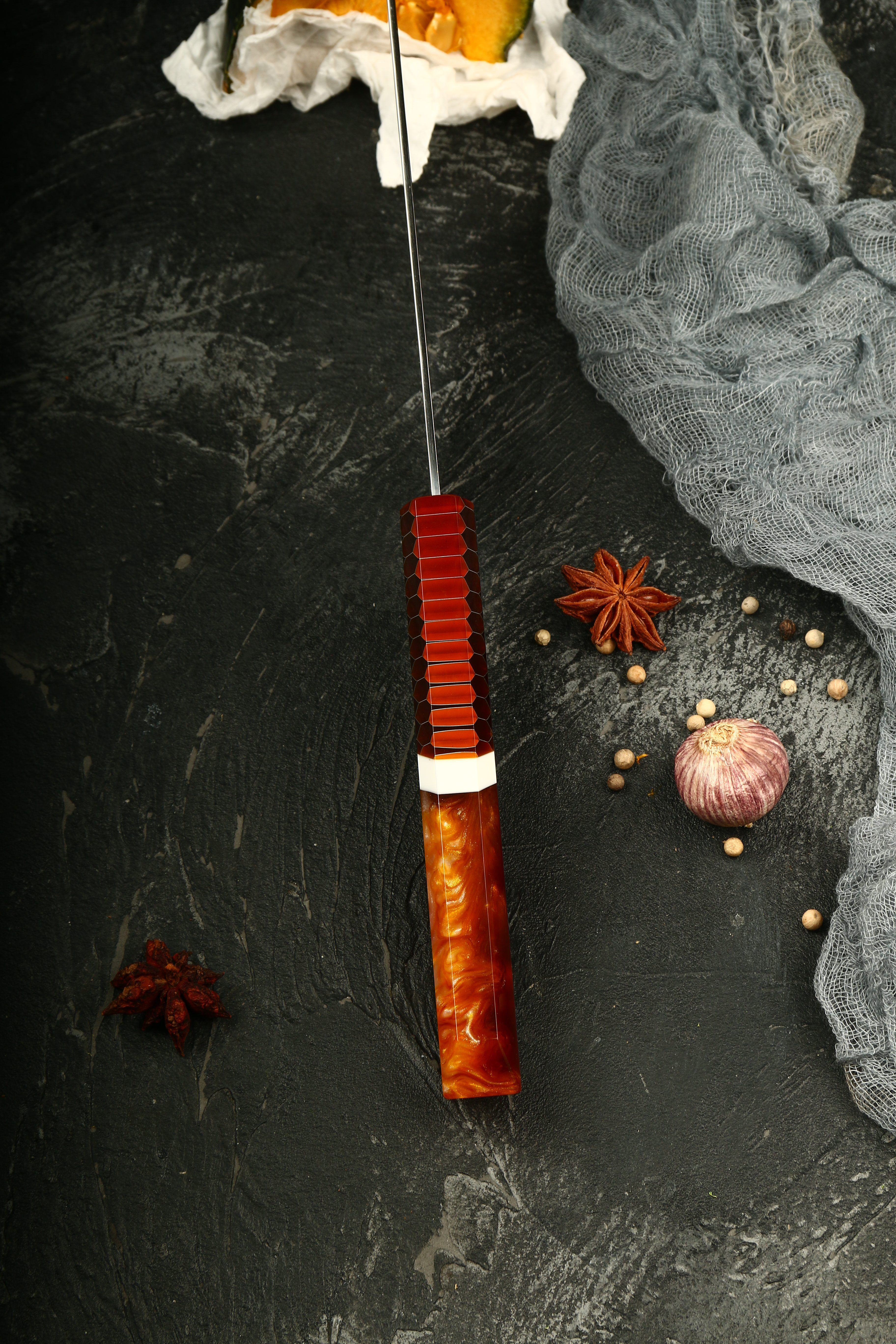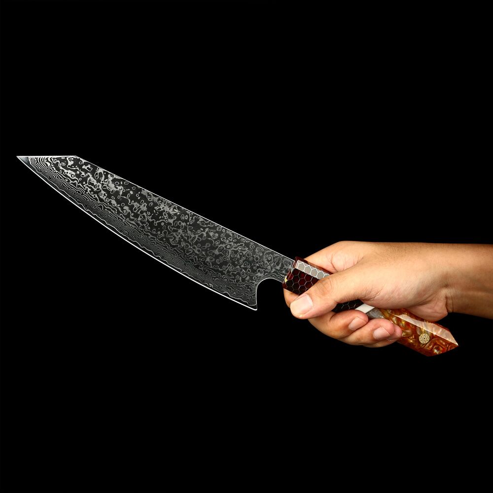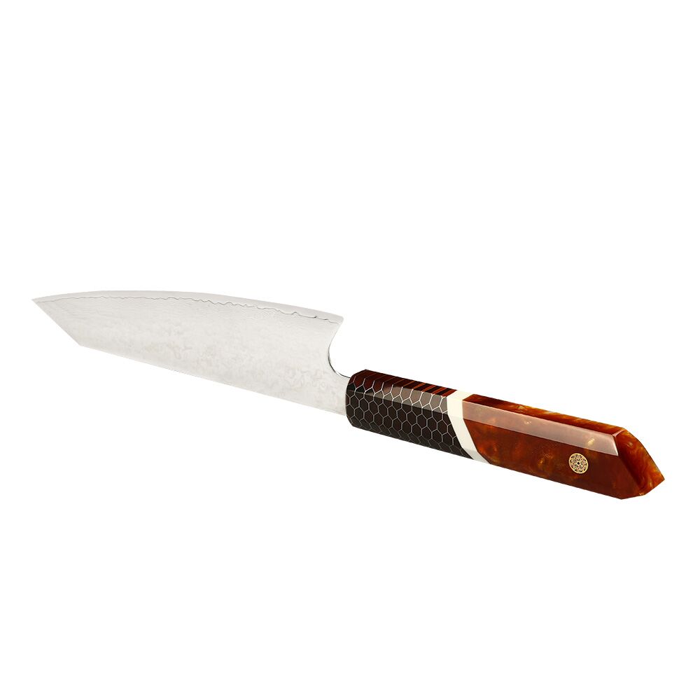 The Japanese Kiritsuke Knife VG-10’s honeycomb resin handle offers the ideal fusion of comfort and innovation. You can maneuver your culinary creations elegantly thanks to the handle’s solid grip and ergonomic design, providing a stable hold. The handle’s characteristic honeycomb pattern gives it a bit of individuality and makes it a visually attractive addition to your kitchenware collection.