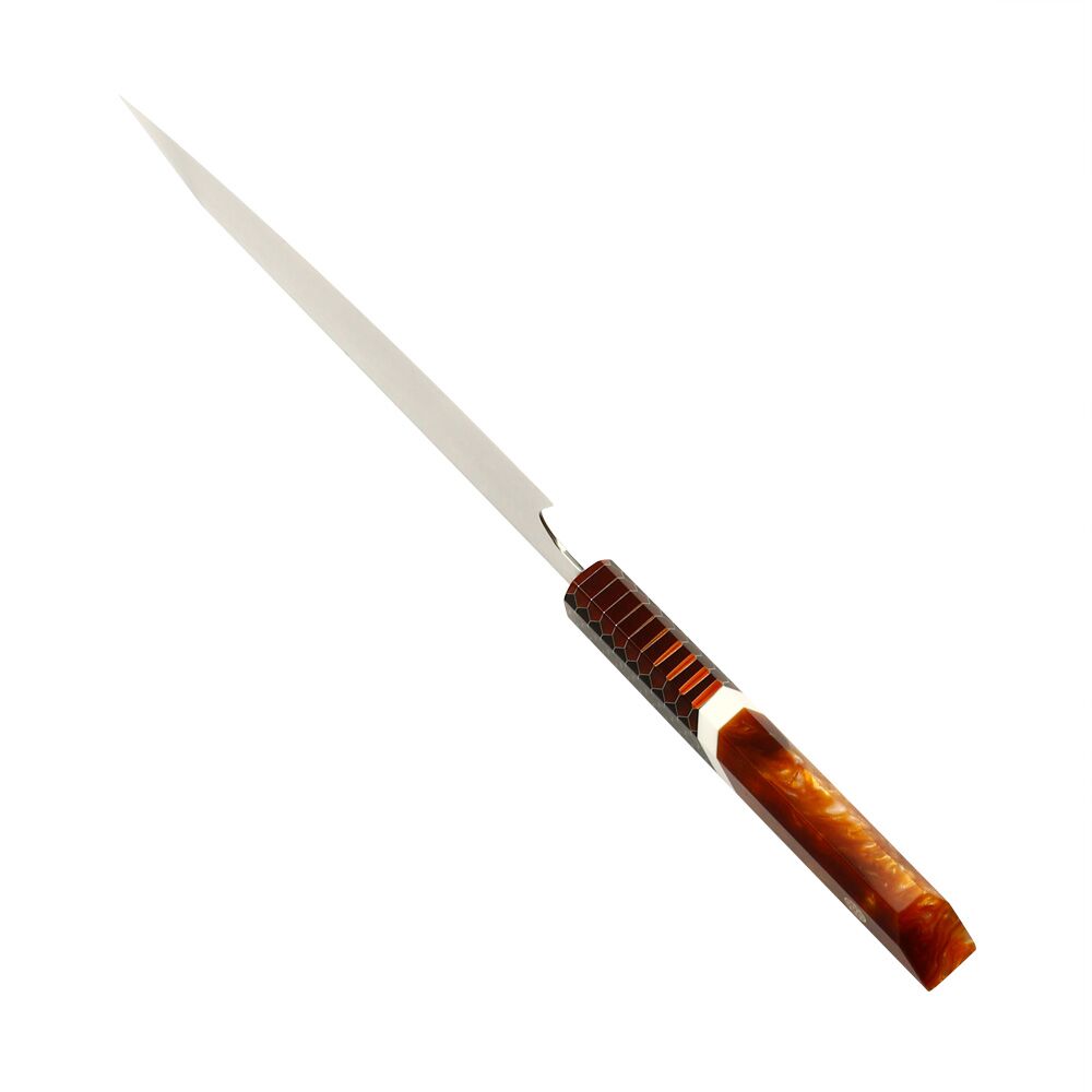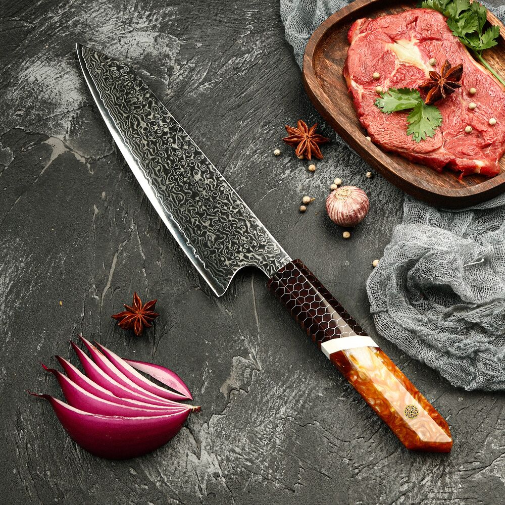 The Kiritsuke Knife VG-10 from Japan upholds a heritage of excellence and respect for age-old Japanese artistry. This knife is a testimony to the craft of making culinary marvels with its VG10 Damascus steel blade, custom engraving option, and honeycomb resin grip. The Japanese Kiritsuke Knife VG-10 gives you the tools to succeed in your culinary ventures, whether you’re a seasoned chef or an enthusiastic home cook.