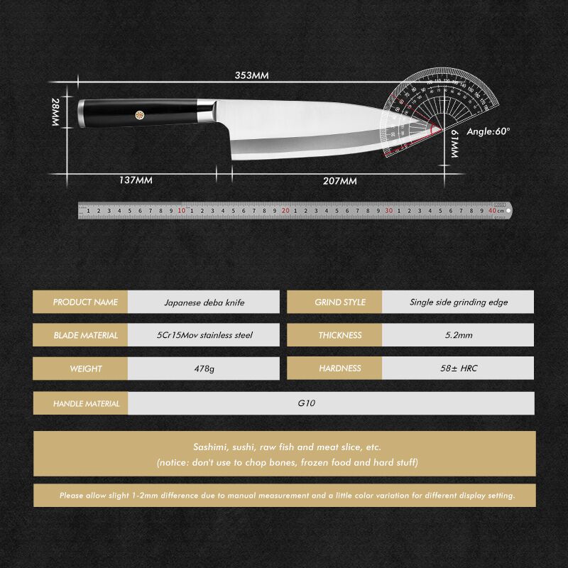 This is a premium Deba-style knife that blends tradition with real-world practicality: 5Cr15MoV stainless steel, single bevel grind, 58 ± 2 HRC, and a durable G10 handle built to handle the rhythm of daily cooking. If you want cleaner slices, better control, and a knife that looks and feels professional, this is the one to reach for—especially once it’s engraved with your own mark.