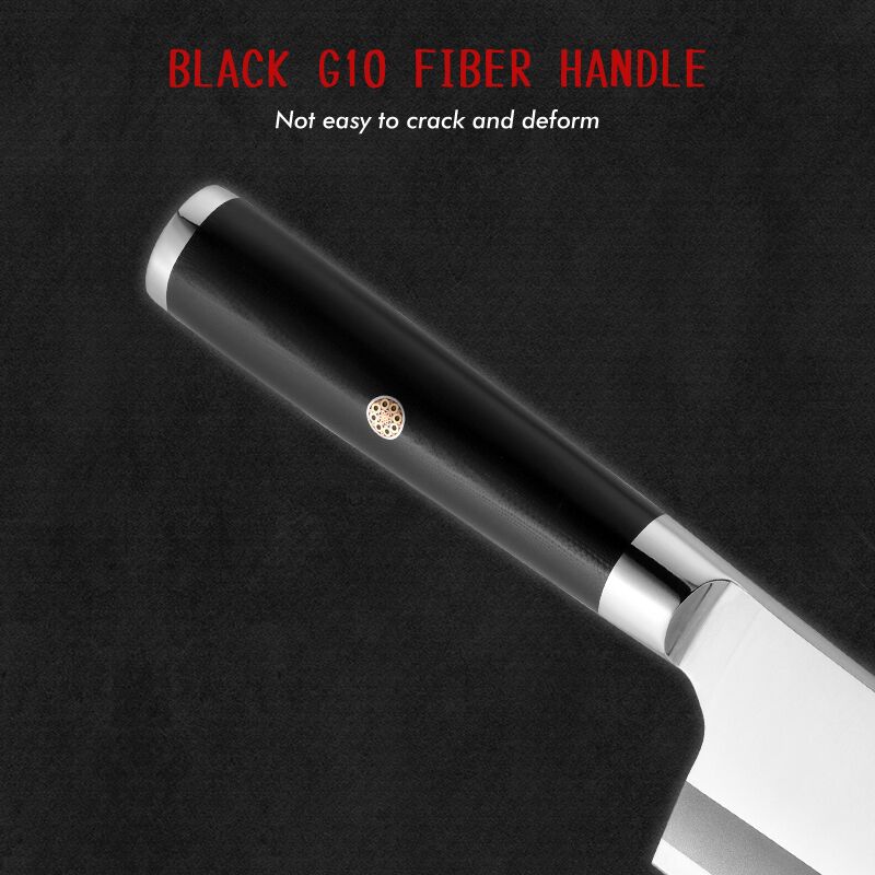 The handle is Black G10 fiber, a tough, moisture-resistant material known for stability and grip. In a kitchen environment—where hands can be wet, oily, or busy—G10 holds steady. The handle measures 137 mm in length and about 28 mm in width, giving you a secure hold without feeling bulky.
